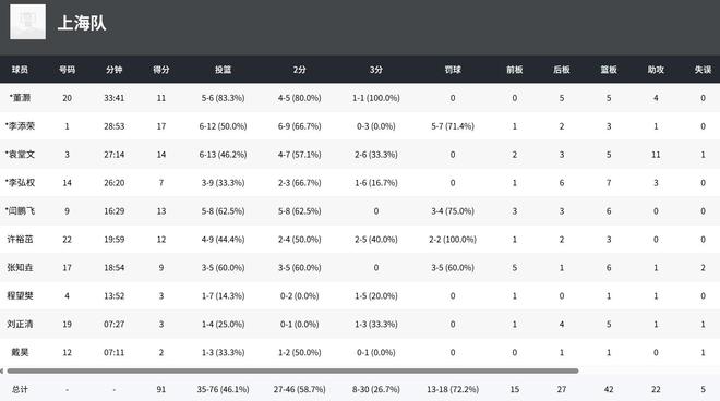 上海男篮李添荣17分3板,袁堂文14分5板11助,闫鹏飞13分6板。